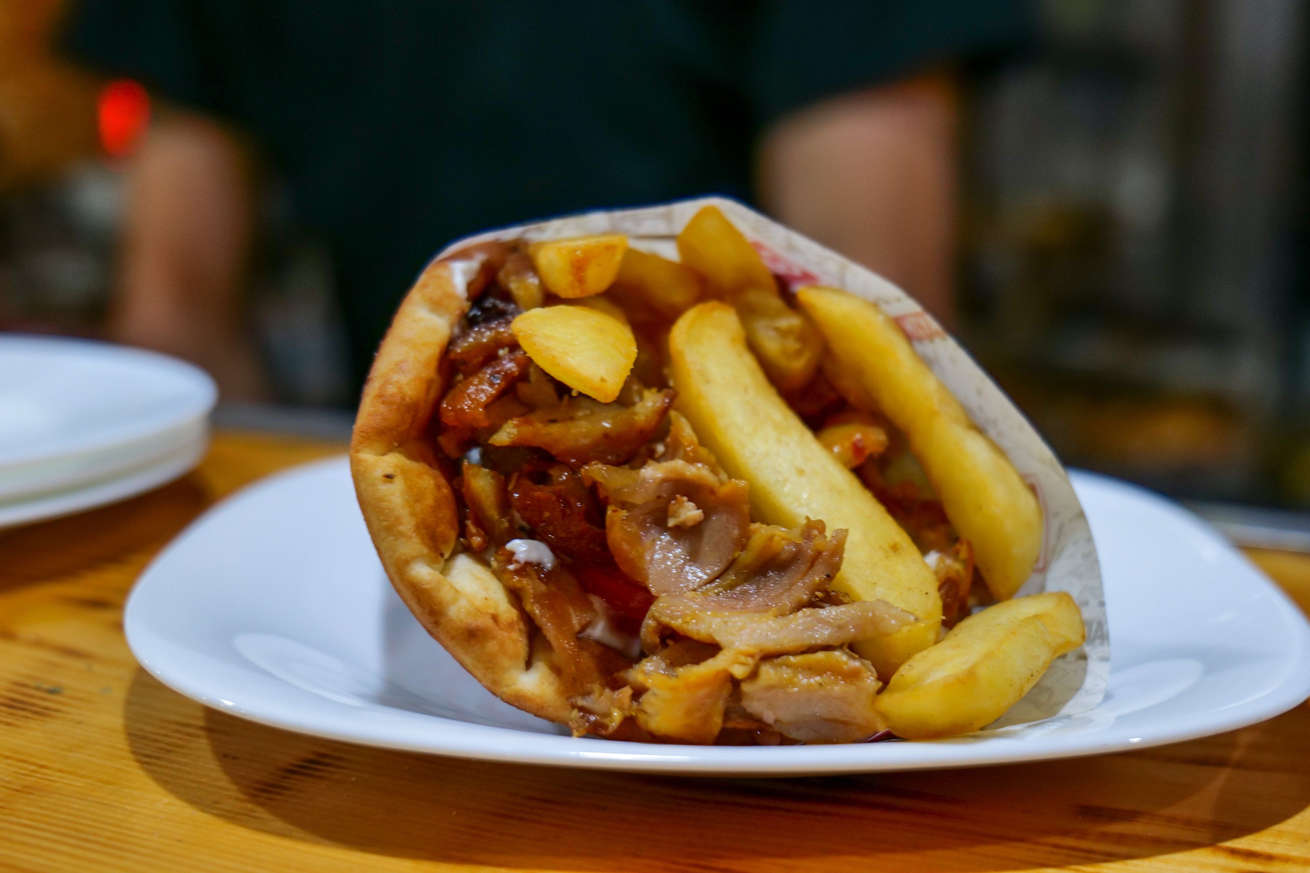 pork meat , tzatziki, tomatoes, fries, onion, lettuce